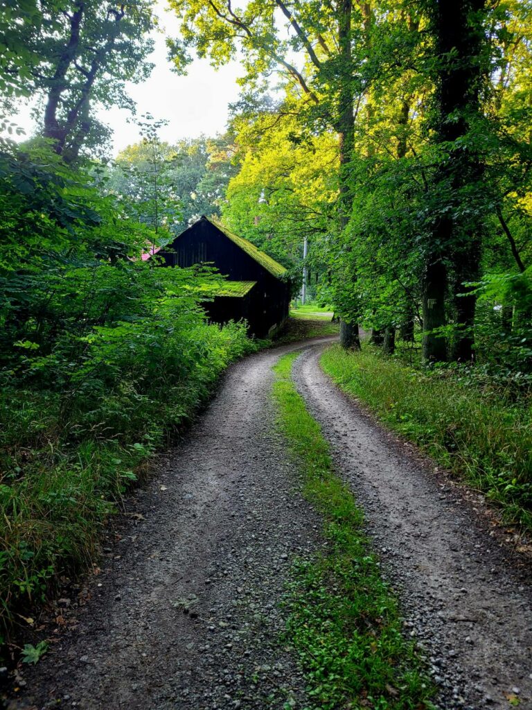 Sielanka kończy się niestety na fragmencie szosy za lasem: pieszy musi się mocno pilnować, bo chodnika brak, a auta mijają na centymetry. To zdecydowanie najmniej przyjemny fragment trasy.